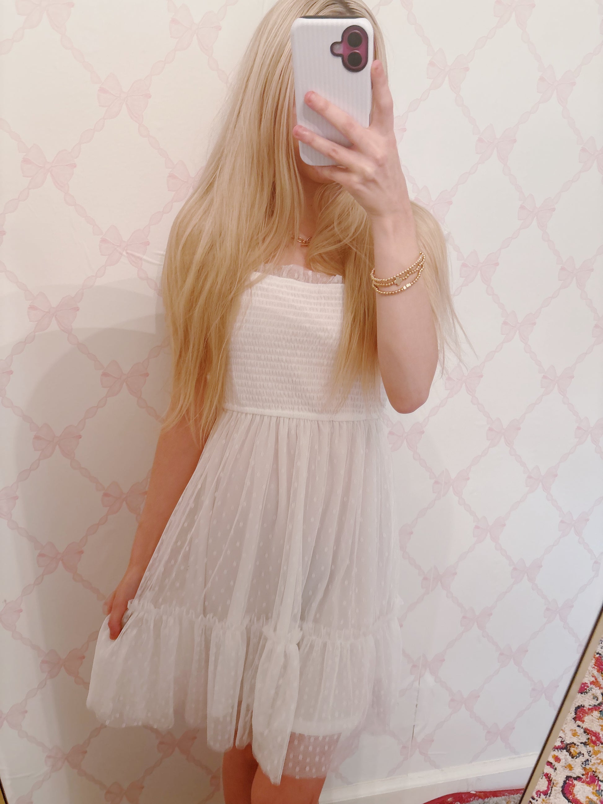 Flirty ruffles, a flattering smocked fit, and soft swiss dot texture — she’s as dreamy as she looks 🤍✨